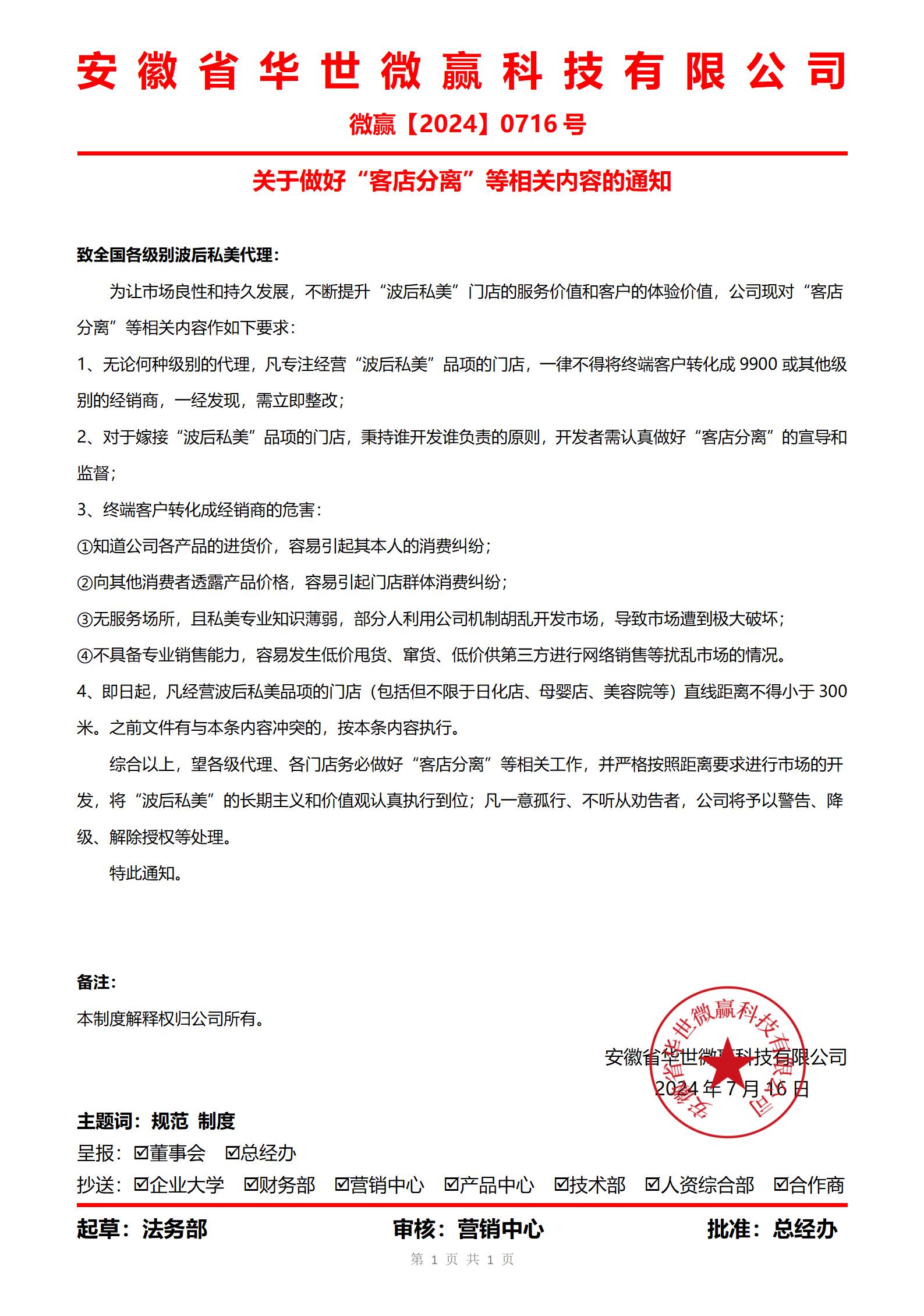 為讓市場良性和持久發展,不斷提升“波后私美”門店的服務價值和客戶的體驗價值,公司現對“客店分離”作如下要求!